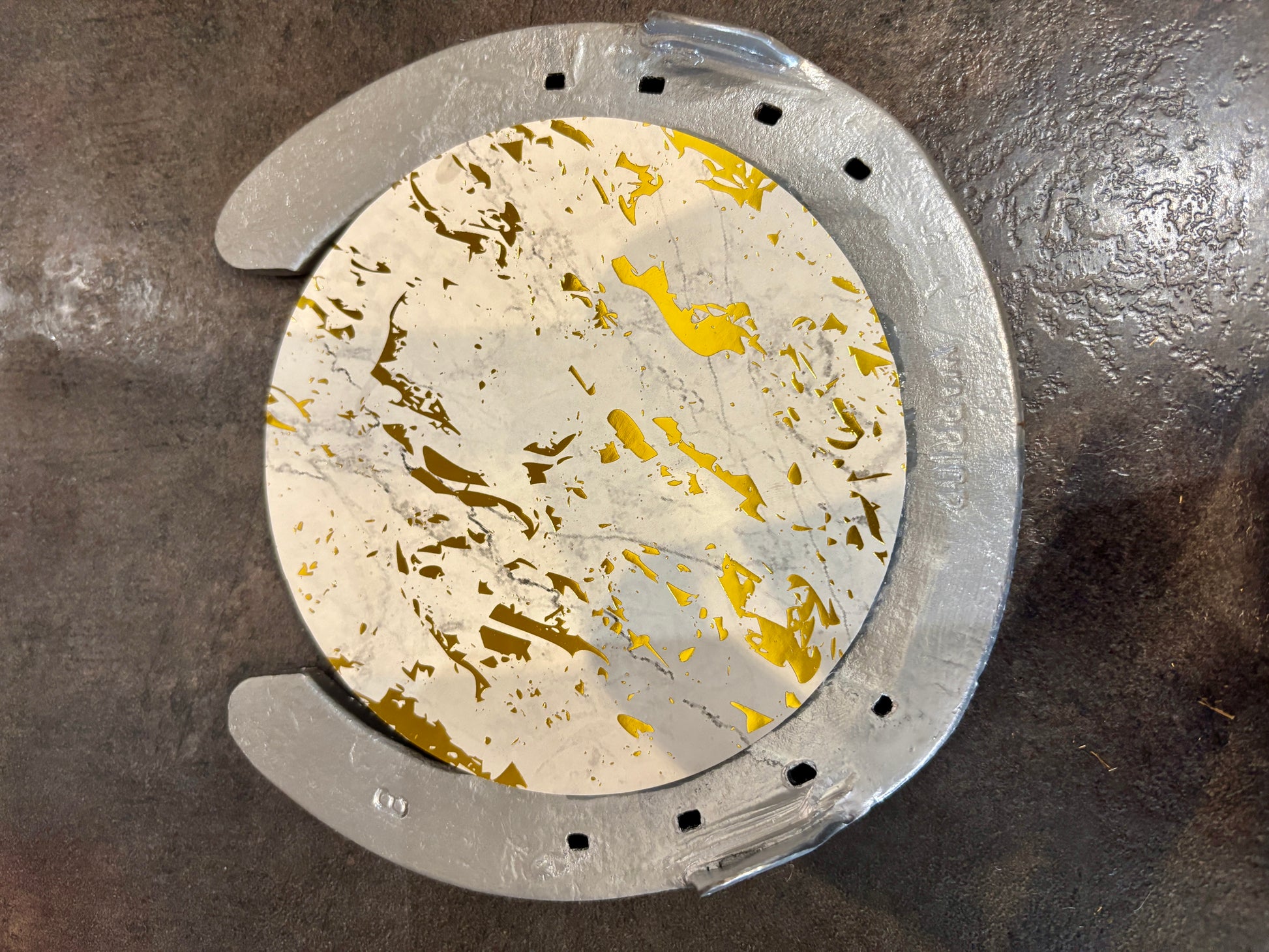 Fer à cheval véritable avec une création unique d’un cd réutilisée avec son vrai trèfle à 4 feuilles séchée . Un vrai porte bonheur multiplier 💫