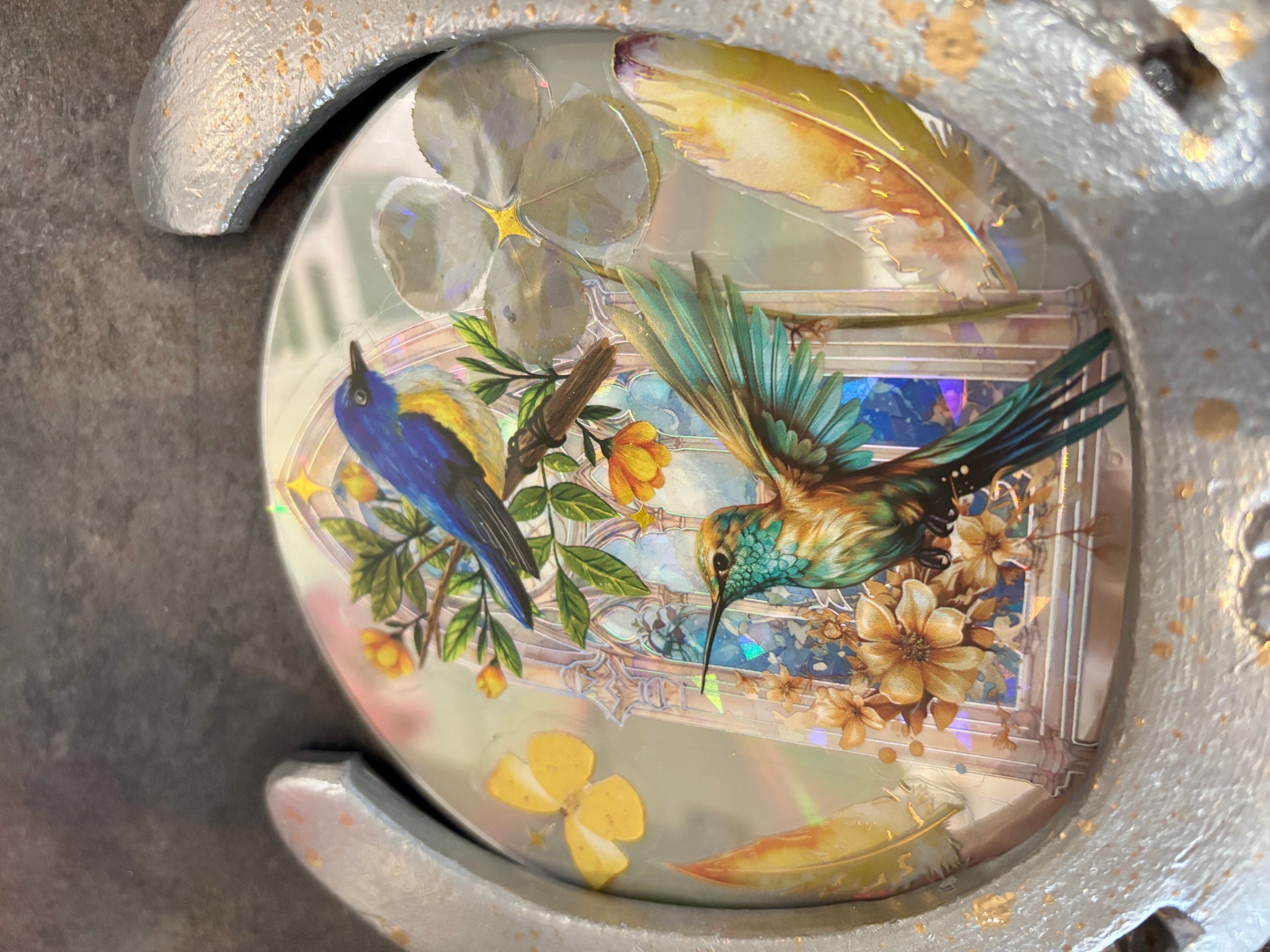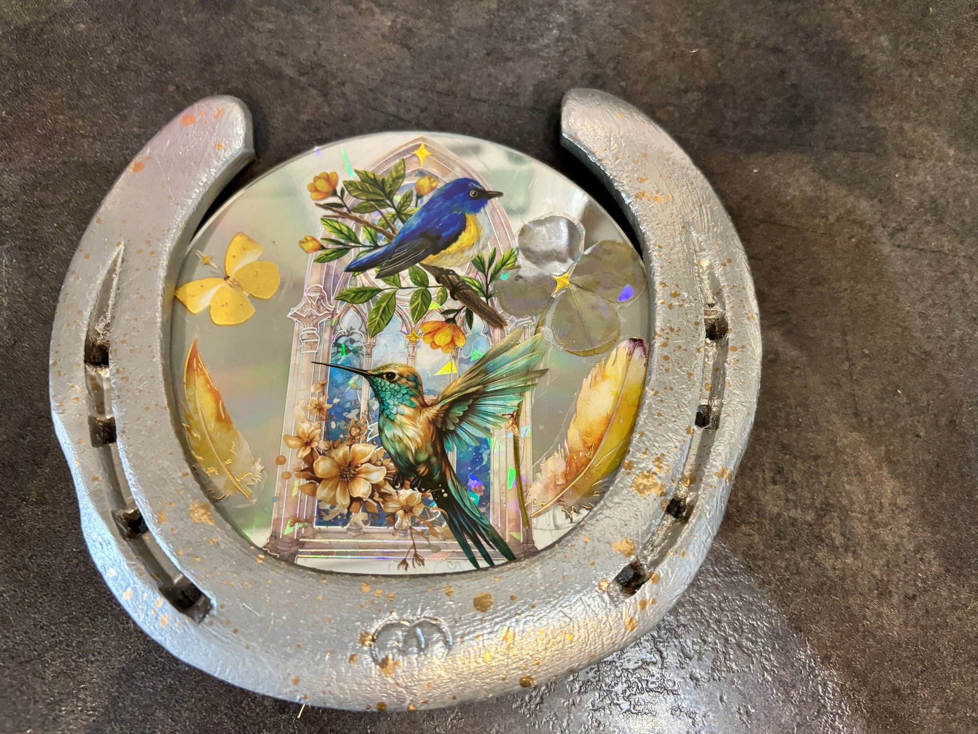Création unique /fer à cheval avec un Cd et son véritable trèfle à quatre feuilles 🍀 oiseaux/colibri
