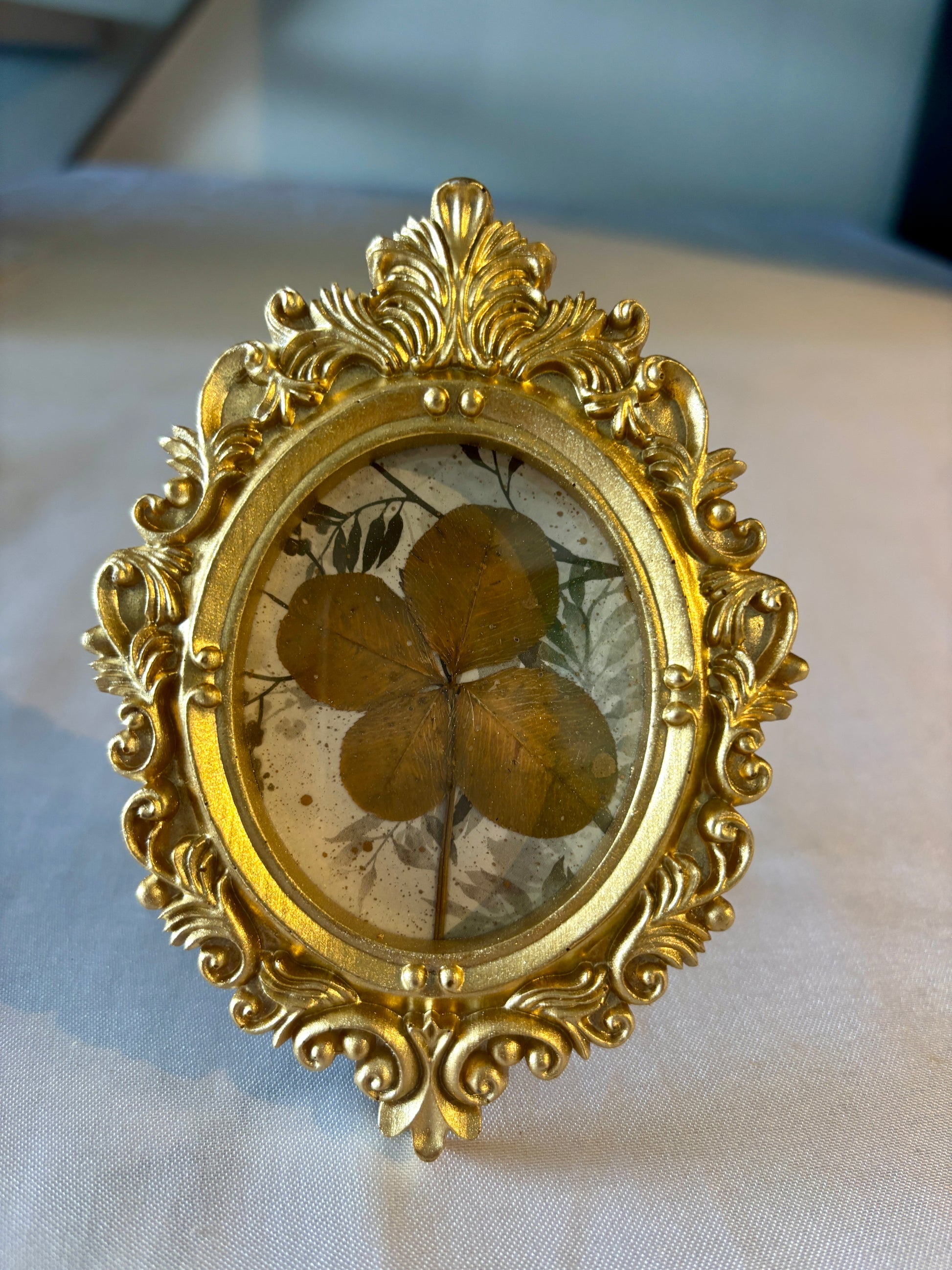🌱 Après séchage et préservation, le trèfle est délicatement placé dans un cadre ancien, ce qui en fait un objet unique, plein de charme et de poésie.