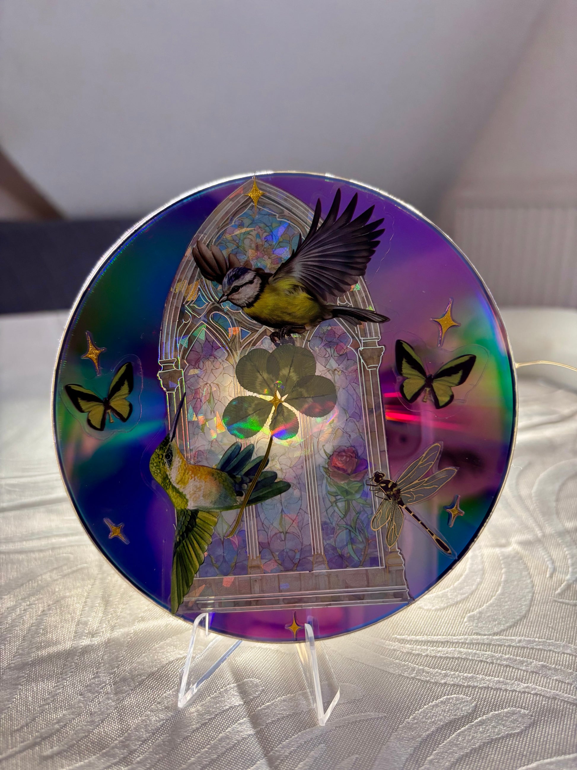 Chaque pièce est une création unique, née du recyclage d’un CD usagé transformé en support d’énergie positive.